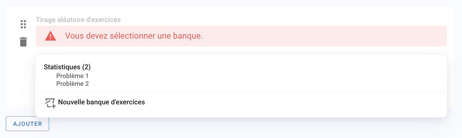 AJOUTERet choisissezExercice aléatoireChoisissez la banque d’exercices dans laquelle tirer aléatoire.